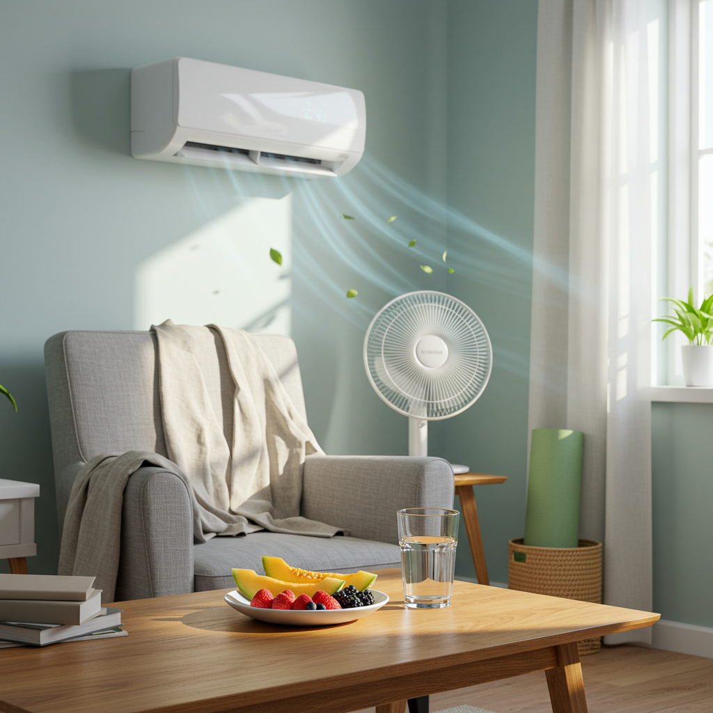 실내 온도는 24~26도를 유지하고, 실내외 온도 차이를 5도 이내로 줄이는 것이 좋습니다. 에어컨 바람이 직접 몸에 닿지 않도록 긴팔 옷이나 가디건을 준비하고, 담요를 덮어 체온을 유지해주세요.