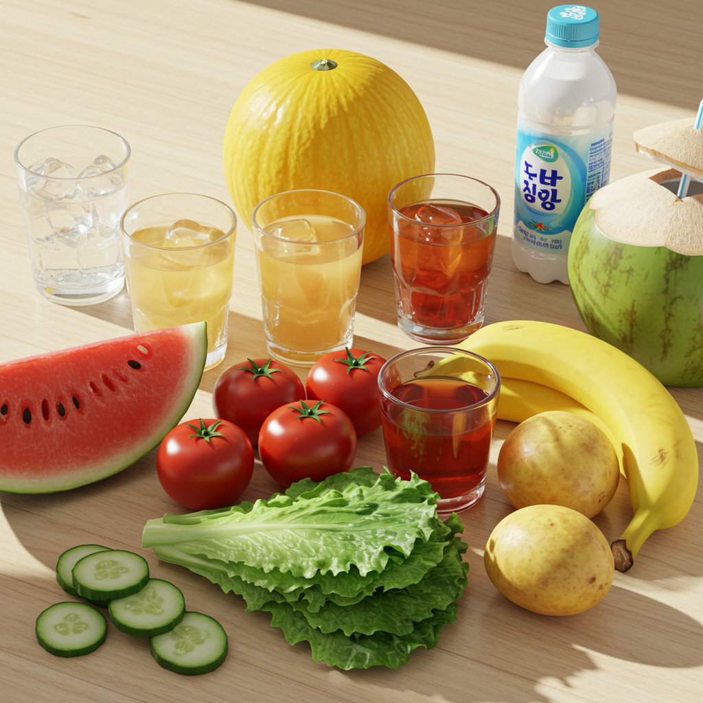 - 수분 함량 높은 과일: 수박, 참외, 토마토, 복숭아, 포도 등은 수분과 비타민, 미네랄이 풍부하여 갈증 해소와 기력 회복에 탁월합니다.