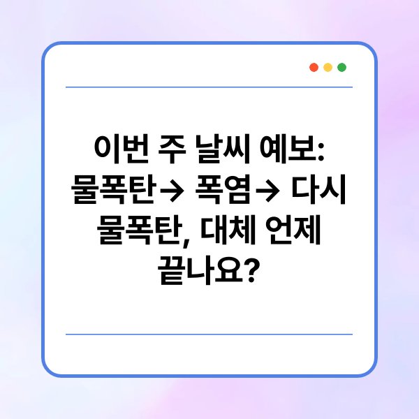 이번 주 날씨 예보는 극단적인 변화로 주목받고 있습니다. 물폭탄이 쏟아졌다가 폭염이 찾아오고, 다시 물폭탄이 예고되고 있습니다. 이러한 기상 변화는 일상의 여러 측면에 영향을 미칠 수 있습니다. 본문에서는 이번 주 날씨의 주요 변화를 정리하고, 각 기상 현상이 미치는 영향에 대해 살펴보겠습니다. 또한, 날씨 변화에 따른 건강 관리 방법도 함께 제안할 예정입니다.